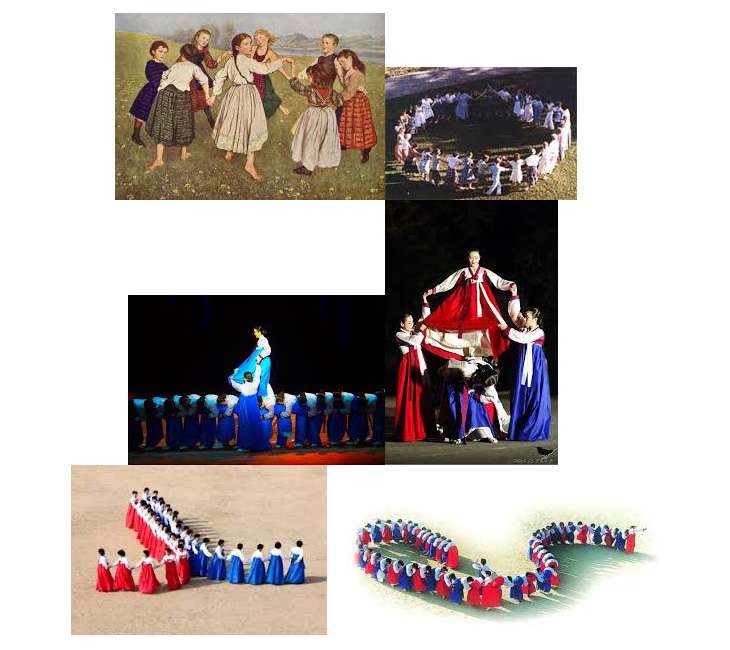 강강술래는 흔히 임진왜란 때 조선 수병들이 매우 많은 것처럼 보여 왜군이 함부로 침입해 들어올 수 없게 하기 위하여 부녀자들로 하여금 남자 차림을 하고 떼지어 올라가 해남에 있는 옥매산(玉埋山) 허리를 빙빙 돌게 한 데서 유래했다고 알고들 있다. 그러나 강강술래는 고대로 내려오는 서클 댄싱(circle dancing)으로 보는 것이 맞다. 서클 댄싱은 악기와 노래가 수반되며 개방형이나 폐쇄형의 원을 이루며 추는 춤이다. 이 춤은 인간이 공동체 생활의 한 부분으로 처음 춤을 추기 시작했을 때부터 내려온 가장 오래된 춤으로 추정된다. 손과 손을 잡거나 손으로 어깨를 잡능 등, 신체를 접촉하며 추는 이 춤은 공동체를 강화하고 고무시키기기 위해 의례와 같은 특별한 때에 원을 이루며 춤을 추었다. 이러한 서클 댄싱은 중동, 동서유럽 전역, 북남미 인디언 등 전 세계 곳곳의 많은 문화가 공유하고 있는 오래된 전통이다. 그 음악과 리듬, 춤의 형태는 지역마다 다양하다. 춤은 부드러우면서도 힘이 넘친다(Watts, 2006; ‘circle dance", https://en.wikipedia.org/wiki/Circle_dance 에서 재인용).
