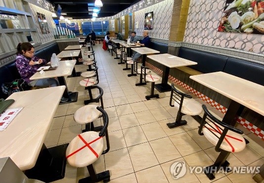 (Left) Seats at restaurants in Taiwan marked about social distance warning.