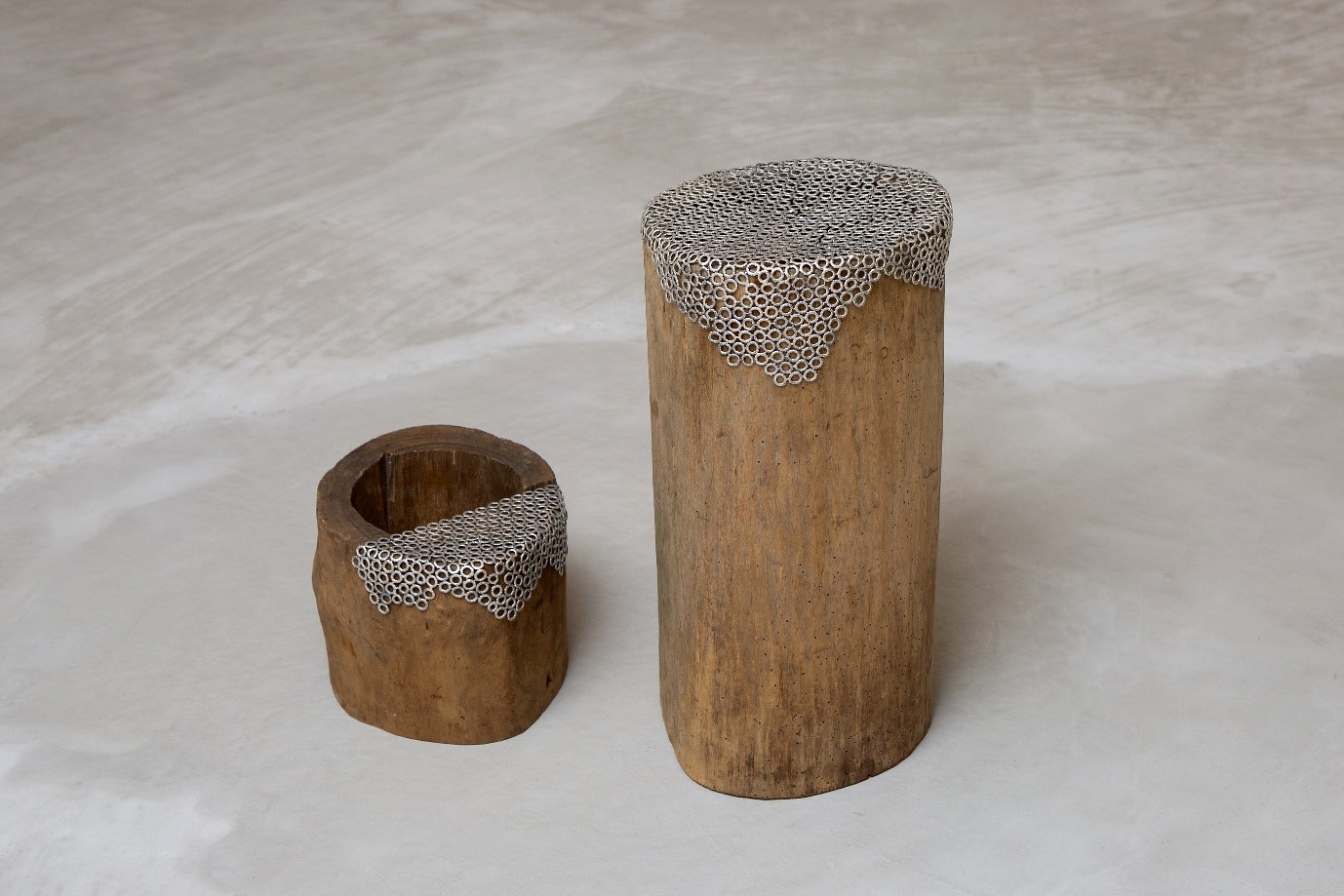 My work can be divided into three categories. Firstly, I love making metal insects, especially ants. Secondly, I work on creating lace with metal. The reason why I’m drawn to lace is because it has feminine texture and evokes the sentiments of my mother and grandmother from the past. My metal lace with its motherly charm is strong yet gentle. Thirdly, I patch up old things like abandoned trees. This type of work offers a healing experience as I take delight in restoring discarded things and bringing them back to life. It feels rewarding to give love to and heal old and discarded yet precious things. For that reason, I patch up, paint and polish trees—which becomes a process of healing.